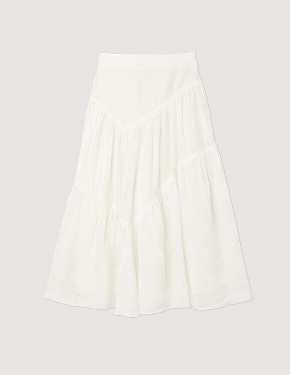 Este tipo de faldas son un imprescindible del verano en el norte, porque son ligeras y cómodas pero a su vez su largura es esencial si refresca. En este caso, esta falda midi de Sandro (185,50 euros) tiene un plus de tendencia: es ligeramente evasé con juegos de volantes y frunces.