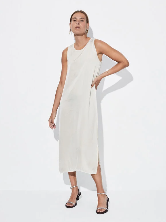 Este es el clon más parecido que hemos encontrado en clave low cost del vestido blanco de Carmen Lomana. Se trata de un vestido midi satinado con cuello redondo, sin mangas y con una abertura lateral en el bajo. Es de la marca Parfois (32,99 euros) y es igual de ligero y confortable que el de la socialité. Con unas sandalias tipo joya, como las de la imagen, nos parece ideal para tomar algo en una terraza por la noche.