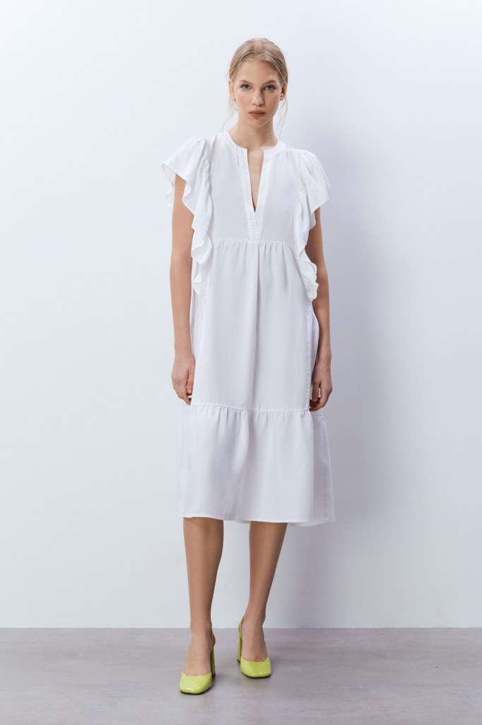 Mientras que esta opción de Sfera (29,99 euros) es la perfecta para las más calurosas. ¿Por qué? Porque este vestido blanco está hecho de tencel, una fibra natural que es muy ligera y transpirable, apta para los días de más calor. Además, nos enamoran esos detalles de volantes que hacen efecto de mangas cortas, muy del estilo de Carmen Lomana. Métele color con una sandalia de tacón en un tono llamativo para ir divina a un restaurante o rooftop.