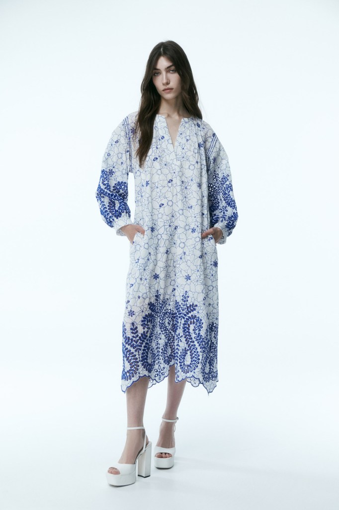 Este lo colocamos en primer lugar porque nos parece uno de los vestidos de las rebajas de Sfera más bonitos. Su diseño con bordados en blanco y azul nos transmite a la perfección el estilo mediterráneo de países como Portugal, Italia, Grecia y, por supuesto, España. Además, es ancho y ligero, incluso cuenta con manga abullonada. Este cuesta un poco más, pero creemos que merece la pena invertir en él ahora antes de que se acabe (39,99 euros).