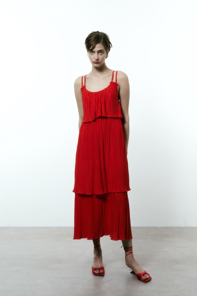 Este modelo nos encanta por su seductor color rojo, y por el diseño plisado y con capas, perfecto para favorecer y estilizar a las mujeres de 50 años. Este vestido de las rebajas de Sfera también cuenta con un tirante doble fino muy elegante, que lo hace ideal para las ocasiones más especiales del verano (15,99 euros).
