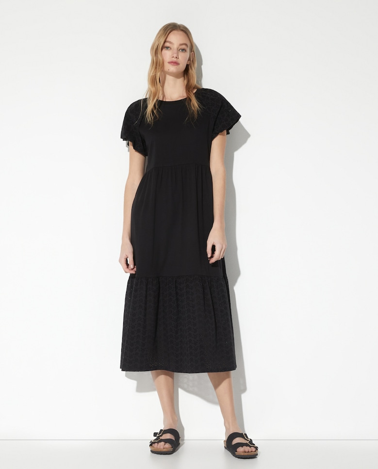 El negro es la elegancia plasmada en un color. Por ello, no lo abandonamos ni en verano. Sobre todo si se trata de vestidos fresquitos y anchos como este de las rebajas de El Corte Inglés que tanto enamora a las mujeres de +50 años. Se trata de una pieza ideal para las noches por su diseño midi en canalé, su manga corta abullonada y los calados en el bajo (11,99 euros).