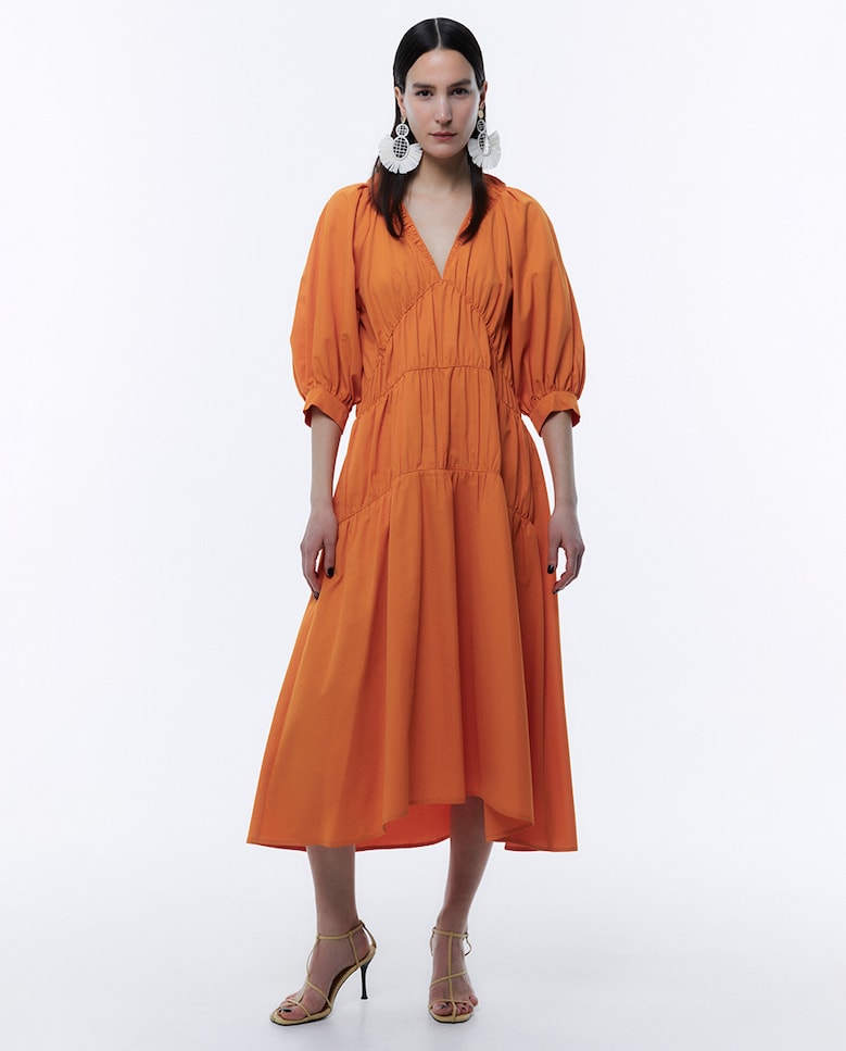 Esta propuesta en rebajas de Sfera en El Corte Inglés nos ha encantado para eventos. Se trata de un diseño elegante, pero a la vez ancho y ligero, perfecto para las mujeres de +50 años que quieran arriesgar en sus ocasiones más especiales. Nos encanta por su largo midi, su escote pico y esos detalles de frunces y bolsillos (19,99 euros).