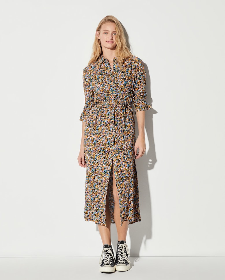 Te diremos que esta opción nos gusta tal que así, con zapatillas, para darle un toque más rejuvenecedor y casual al vestido de flores de Easy Wear en las rebajas de El Corte Inglés. Por su manga larga, nos parece ideal para las noches de verano en las que refresca, pero también te diremos que es una opción en la que invertir de cara al entretiempo. Es una de las opciones más baratas, pues cuesta 12,99 euros.
