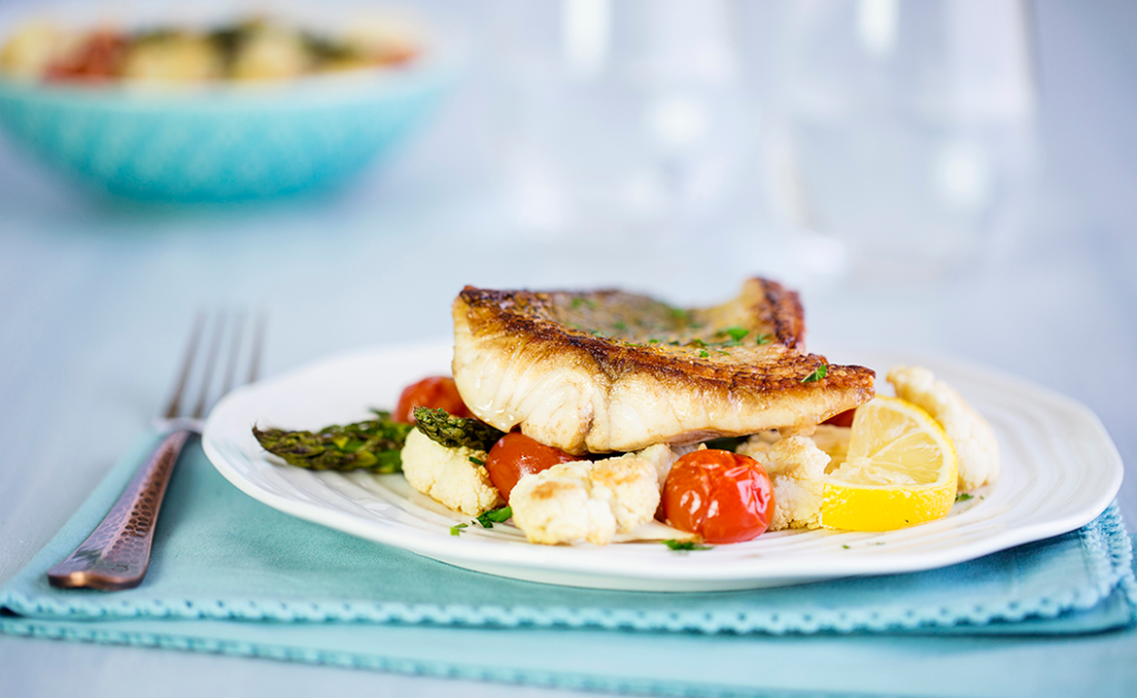 - Coloca las verduras asadas en un plato y cúbrelas con un filete de gerret.