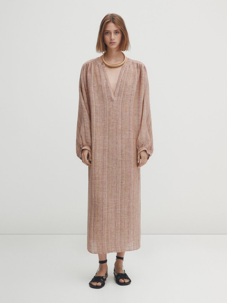 Las opciones tipo túnica son ideales para los días de playa y desconexión, como este vestido en lino con estampado de rayas de las rebajas de Massimo Dutti. Dentro del estilo desenfadado y casual que lo caracteriza, nos parece una opción más que elegante para las mujeres de +50 años en las noches de verano por su silueta recta y ancha  (99,95 euros 49,95 euros).