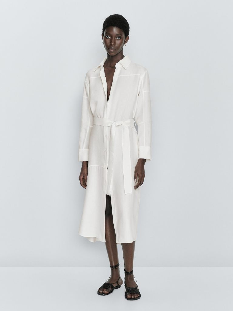Los vestidos camiseros son una de las opciones favoritas de las mujeres de +50 años porque son elegantes y sientan genial. Por ejemplo, este diseño en blanco con costuras a la vista de las rebajas de Massimo Dutti es cómodo y ligero para los días de verano, además de súper elegante y bonito (89,95 euros 39,95 euros).