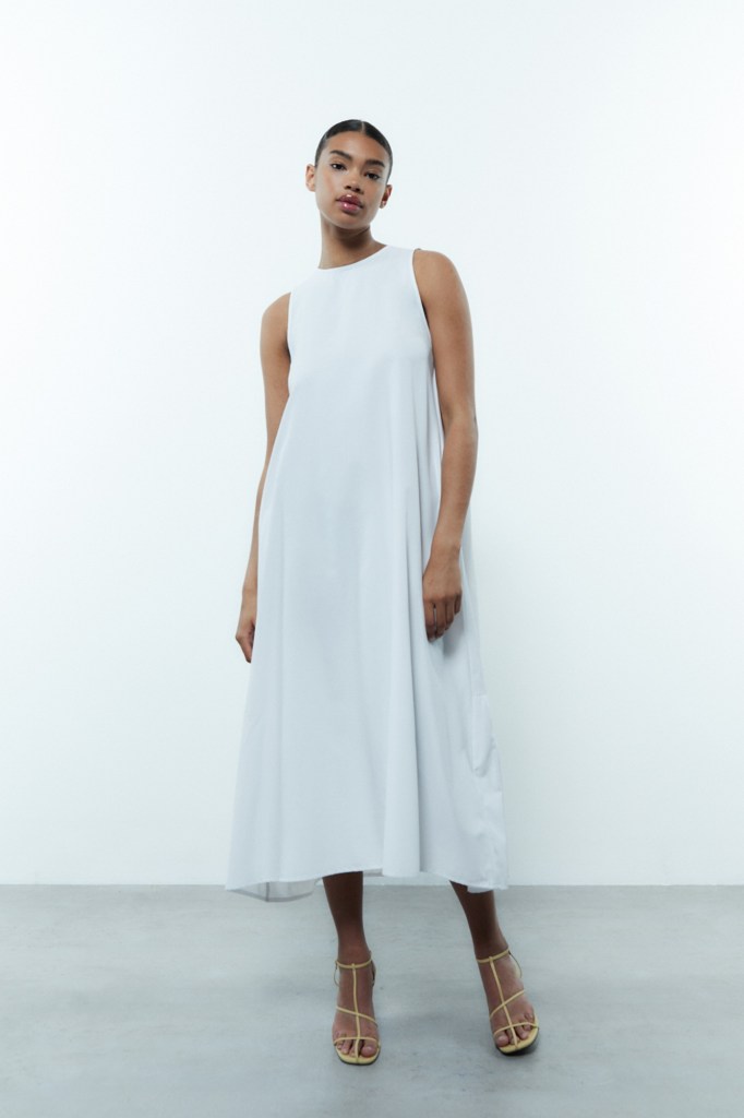 En las rebajas de Sfera puedes encontrar varios modelos coloreados con este binomio tan elegante e inmortal, el del blanco y el negro. En este caso, se trata de un vestido recto con silueta nada ajustada, tirantes y escote en pico súper femenino. Al igual que el anterior, cuesta 19,99 euros.
