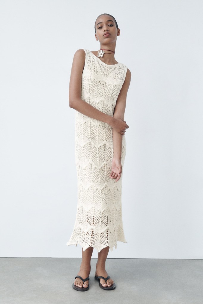 Otra opción súper veraniega es este vestido midi de punto con calados de Zara. Es ideal para ir a playa con unas sandalias planas y un sombrero, pero también para tomar algo por la noche con unas cuñas de esparto y un bolso. Cuenta con un diseño recto y nada ajustado muy cómodo (29,95 euros).