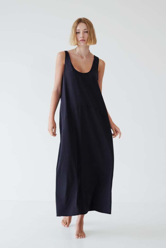 Y por último, os dejamos este vestido midi confeccionado en algodón de Zara. Es el que cuenta con una silueta más ancha y cómoda, además de un cuello redondo, tirantes anchos y un color negro con efecto lavado (22,95 euros).