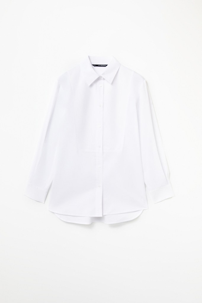 Es normal que este básico de fondo de armario esté arrasando entre las mujeres de +50 años. Las camisas blancas son esenciales para el día a día: para la oficina, como base en un look neutro... pero también para eventos, por ejemplo bajo un traje negro. Esta de Sfera cuenta además con un cuello camisero con pechera en piqué que le da un toque especial (29,99 euros).