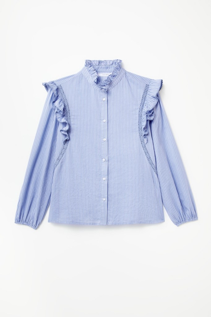 Obviamente una camisa de rayas no podía faltar, y este modelo de Sfera es precioso porque tiene detalles de volantes y puntillas que la hacen romántica y femenina. Además, es una de las camisas más baratas de Sfera (15,99 euros).