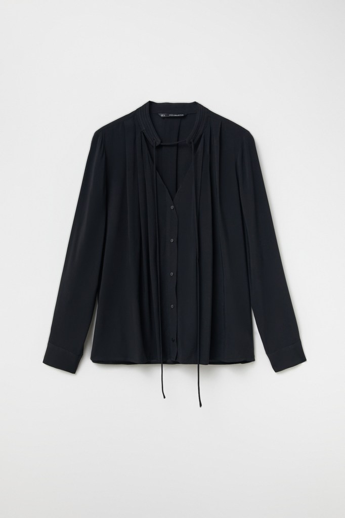 Otro básico de nuestro vestuario son las camisas negras, y este modelo de Sfera está triunfando entre las mujeres de +50 años porque es bonita por su lazada en el cuello y ese detalle de chocker, pero también cómoda por su tejido fluido (29,99 euros).