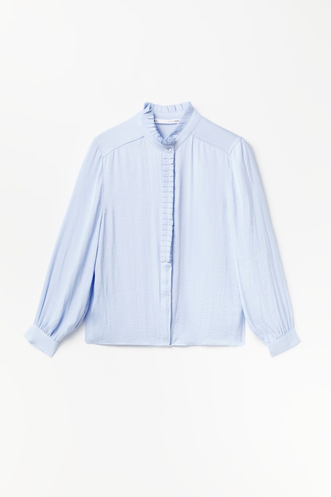 Las camisas azul cielo son un esencial para combinar con faldas o pantalones beiges y hacer looks de oficina ideales y elegantes. Este modelo de Sfera cuenta con detalles plisados en el cierre y en el cuello, además de una silueta cómoda y ancha, y por menos de 20 euros (19,99 euros).