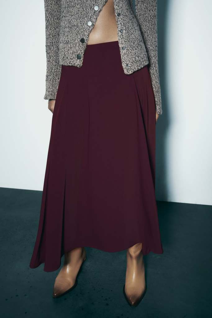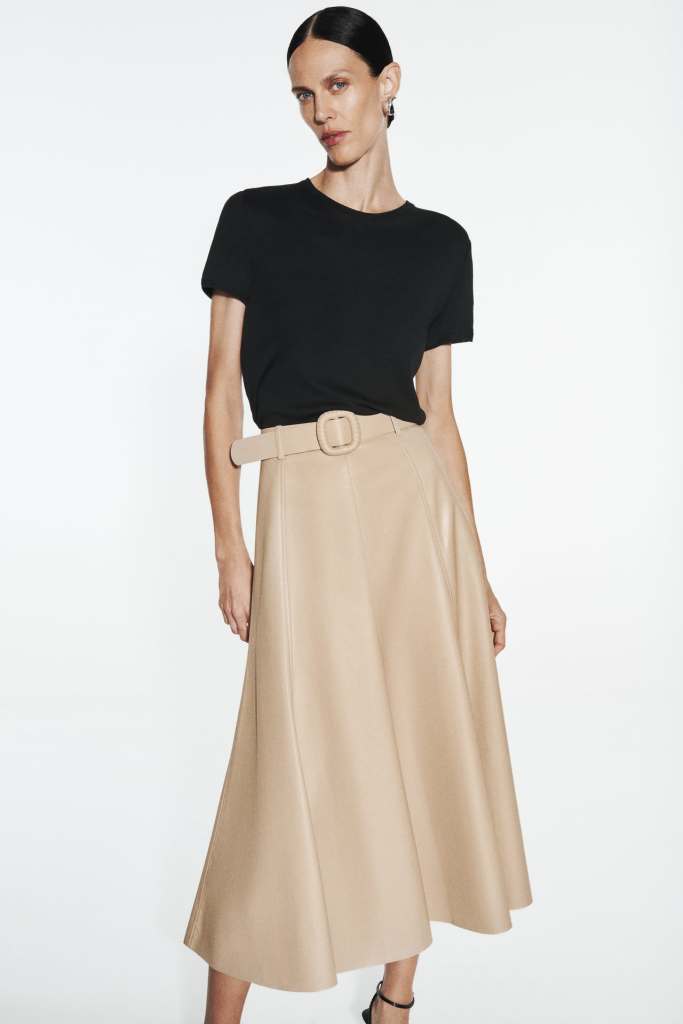Este es uno de los modelos que más gustan a las mujeres de +50 años por la silueta evasé con vuelo con el que cuenta. Esta falda de Zara cuenta con tiro alto con trabillas y un cinturón con hebilla forrada trenzada en mismo material que queda perfecto para marcar la cintura, aunque si lo prefieres puedes ponerte la camisa por encima. Además, cuenta con un material efecto piel súper combinable con muchos colores (29,95 euros).