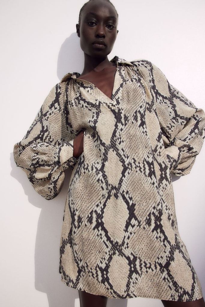 Los vestidos cortos también tienen cabida en esta selección de modelos de H&M que arrasan entre las mujeres de +50 años. Y más si se tratan de piezas como esta con estampado de animal print, en concreto de septiembre. Es de corte holgado con cuello camisero, escote en V y mangas globo ideales. Y también cuesta menos de 30 euros (25,99 euros).