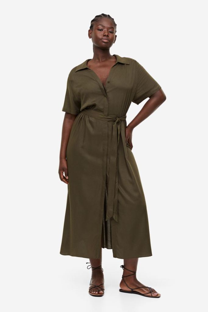 Por supuesto, si hablamos de otoño no pueden faltar los colores propios de la estación, como este vestido verde caqui de H&M que nos enamora. Se trata de un modelo que estiliza y es súper cómodo gracias a su largo midi con cuello camisero, escote de pico, falda evasé con bajo redondeado y con cinturón de anudar para ajustar la cintura (24,99 euros).
