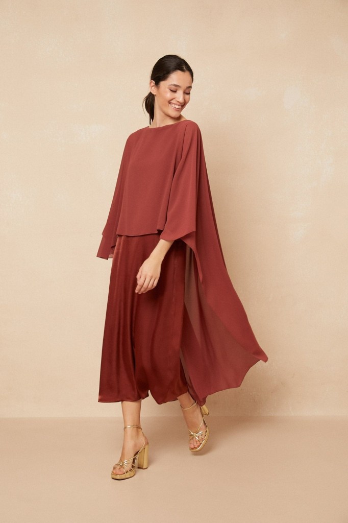Y, para terminar, os traemos una opción un pelón más cara pero súper elegante: los vestidos de invitada de Bimani. Esta sí que es una marca que nació con prendas para eventos, y por poco más de 100 euros puedes encontrar piezas tan especiales y perfectas para las mujeres de +50 años como este vestido en un color marrón otoñal. Se trata de una pieza fluida con largo tobillero en tejido satinado, que cuenta con escote redondo en el delantero, escote pico en la espalda y ese detalle tan sofisticado de capa multiposición incorporada que tanto se lleva (111,30 euros).