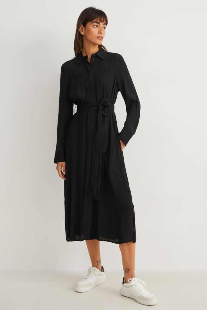 Un vestido negro siempre favorece porque, como se suele decir, estos colores oscuros estilizan mucho. En este caso, C&A propone un vestido camisero de largo midi que es sueltecito, pues cuenta con una silueta holgada que puedes justar con su cinturón en la cintura. Como ves en la imagen, queda ideal con unas zapatillas blancas, pero con unas botas negras también pegan (39,99 euros).