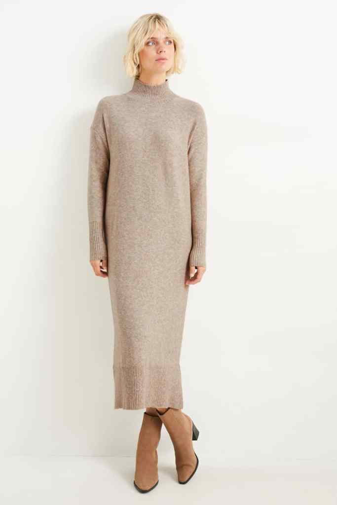 Para las más frioleras, no podíamos no seleccionar en este artículo de vestidos sueltecitos de C&A este modelo de punto. Como veis en la imagen, tiene una silueta recta y nada ajustada que lo hace súper cómodo. Nos encanta para combinarlo con unas zapatillas del mismo color para crear un total look en tonos neutros, pero también queda ideal con unas botas altas de tacón. Se corona con un cuello alto que lo hace calentito y con unas aberturas en el bajo que permiten libertad de movimientos (34,99 euros).