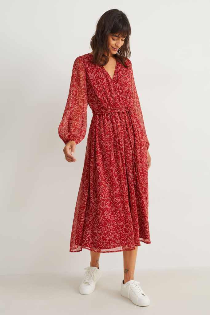 He aquí otro de los vestidos sueltecitos más baratos de C&A: este modelo cruzado con cintura elástica y cinturón para anudar a la cintura. Cuenta con un tejido ligero que no se ajusta nada al cuerpo (y que no se arruga). Como ves en la imagen, queda muy bien con unas zapatillas blancas para ir a trabajar o para el día a día, pero también lo puedes combinar con unas botas altas planas para los días de frío (25,99 euros).
