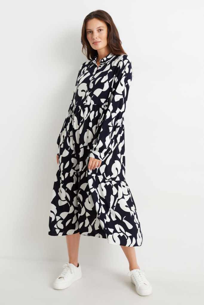 Este es uno de los vestidos más sueltecitos que hemos encontrado en C&A. Se trata de un modelo que, además de tener un diseño camisero súper holgado con una caída suave que triunfa entre las mujeres +50, tiene un estampado blanco y negro que pega tanto con unas zapatillas como con unas botas. Además, es uno de los vestidos más baratos que puedes encontrar en esta tienda para el otoño (27,99 euros).