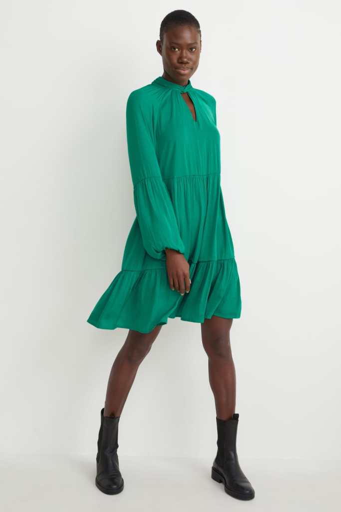 Si buscas un modelo más corto, por ejemplo por encima de la rodilla, este vestido sueltecito de C&A nos parece ideal. Tiene una línea evasé de tejido liso y fluido con abertura en el delantero, falda de volantes y nudo en la nuca, así que nos parece un vestido para reservar para esas ocasiones especiales como eventos y lucirlo con una bota de caña alta con tacón, aunque como ves en la imagen queda ideal también con una bota plana para el día a día (31,99 euros).
