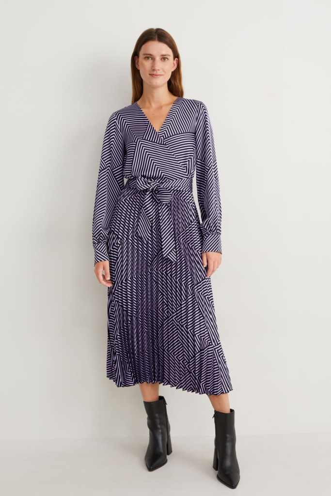 Y como última propuesta, os dejamos un vestido suletecito de C&A que tiene un diseño plisado y cruzado con cintura elástica y cinturón para anudar que enamorará a las mujeres +50. Su estampado con diseño gráfico en azul marino y blanco, hace que quede ideal con zapatillas, pero también con unos botines planos o de tacón (49,99 euros).