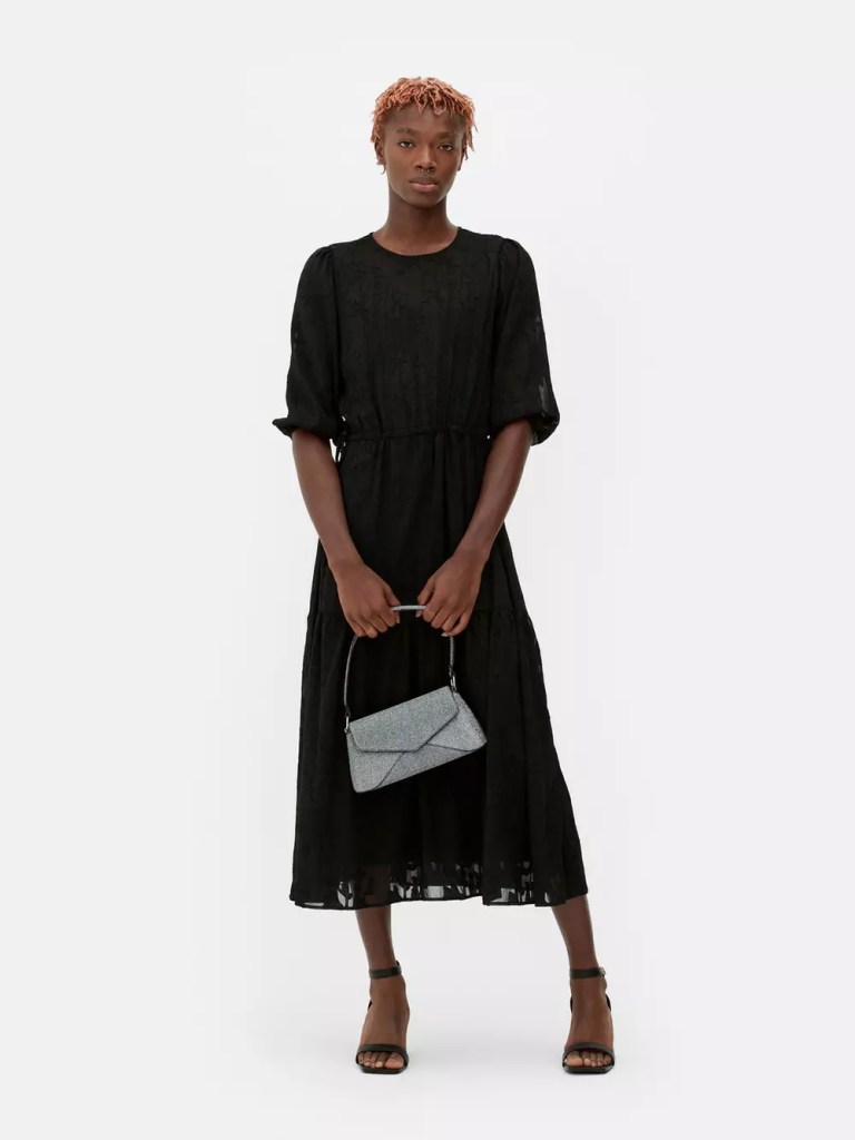 Son los reyes indiscutibles de la temporada de Navidad: los vestidos de brillo. En este caso, se trata de un modelo elegante y glamuroso porque es muy sutil, ya que se trata de un vestido sueltecito negro que cuenta con detalles de hilo metalizado plateado. Aunque es holgado, tiene unos lazos para ajustarlo a la cintura, pero nos encanta cómo queda suelto con sus mangas abullonadas. Además, está tirado de precio, pues solo cuesta 24 euros. Nos parece ideal para una cena con familia o amigos.