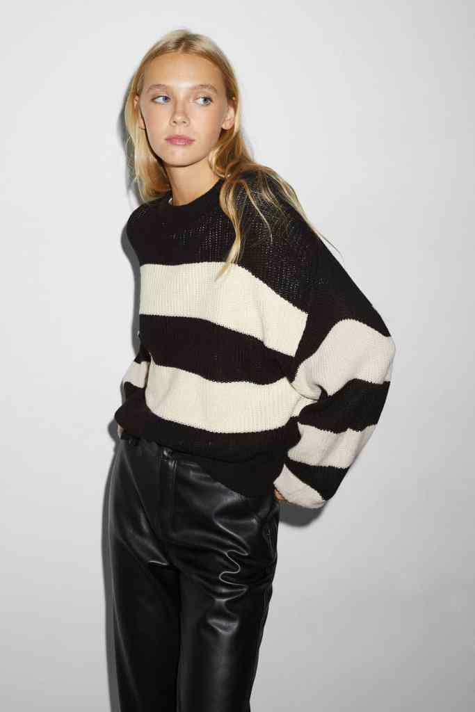 Y como colofón final, una prenda de punto que es súper tendencia en esta temporada: un jersey de rayas. Son ideales para aportar un toque distinto a los estilismos gracias a su estampado, que este modelo de C&A es en blanco y negro. Es súper holgado para conseguir el confort total, así que no nos extrañan que lo estén agotando las mujeres +50 para hacer frente a la ola de frío porque también está tirado de precio (15,99 euros).