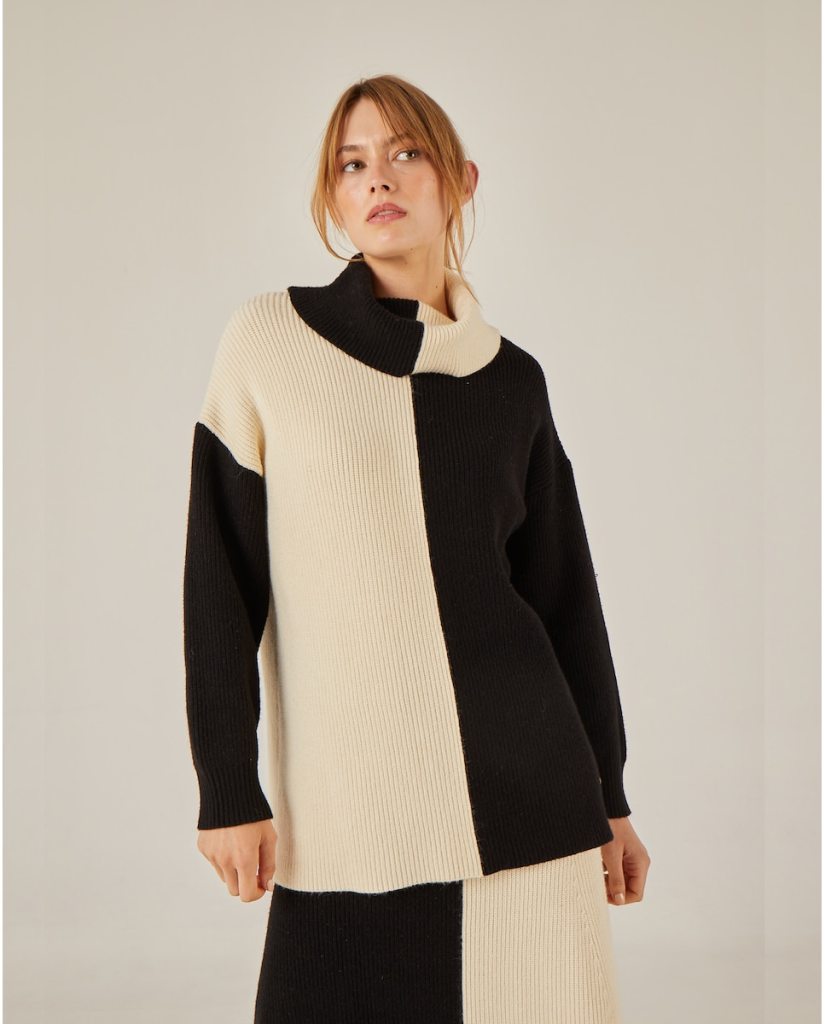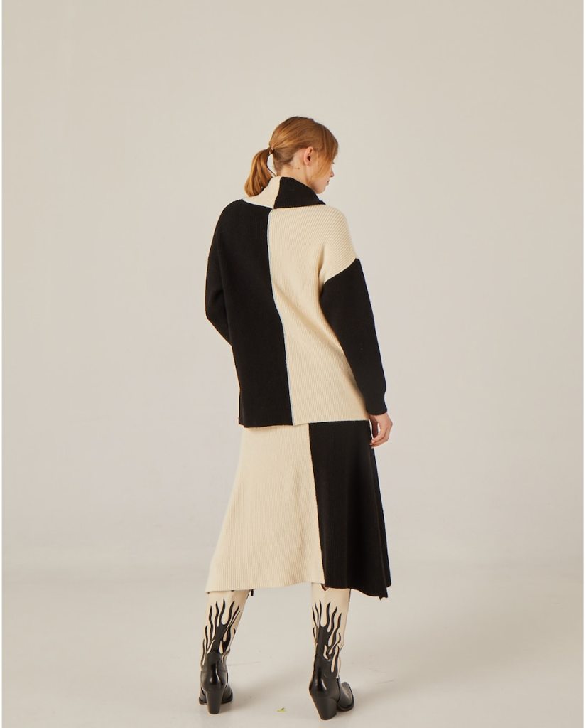 Como podéis apreciar, se trata de dos piezas bicolor, que mezclan dos tonos neutros y básicos durante los meses de invierno: el negro y el beis. Al tener esta combinación de colores a ambos lados de las prendas, este conjunto de punto de El Corte Inglés es súper favorecedor, ya que hace un efecto óptico que estiliza y alarga la figura.
