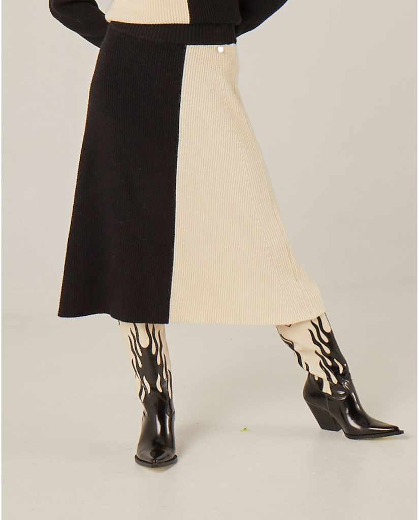 Y si nos centramos en la falda, se trata de un favorecedor modelo midi de tiro alto. Una vez más, al tener una silueta holgada que se va haciendo más ancha hacia el bajo, resulta una pieza que estiliza y favorece mucho. Y junto a su jersey a conjunto, forma un set calentito y cómodo para diario.