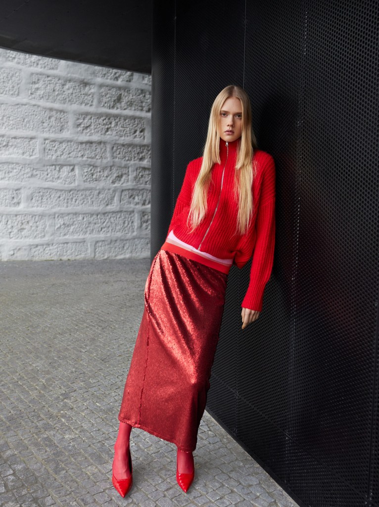 Conjunto de jersey rojo y falda de lentejuelas de Parfois para Navidad