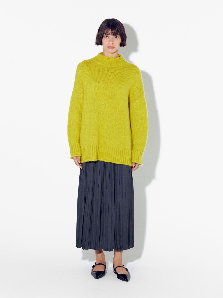 Para comidas de empresa, que tampoco hay que ir excesivamente arreglada, Parfois propone conjuntos de jersey y falda midi más casuales pero igual de cómodos. Por ejemplo, en este look barato el protagonista es este jersey de lana extracalentito y largo en color amarillo (32,99 euros), que sobresale sobre una holgada falda plisada en color azul marino, y que cuenta también con cintura elástica para un extra de comodidad (29,99 euros).
