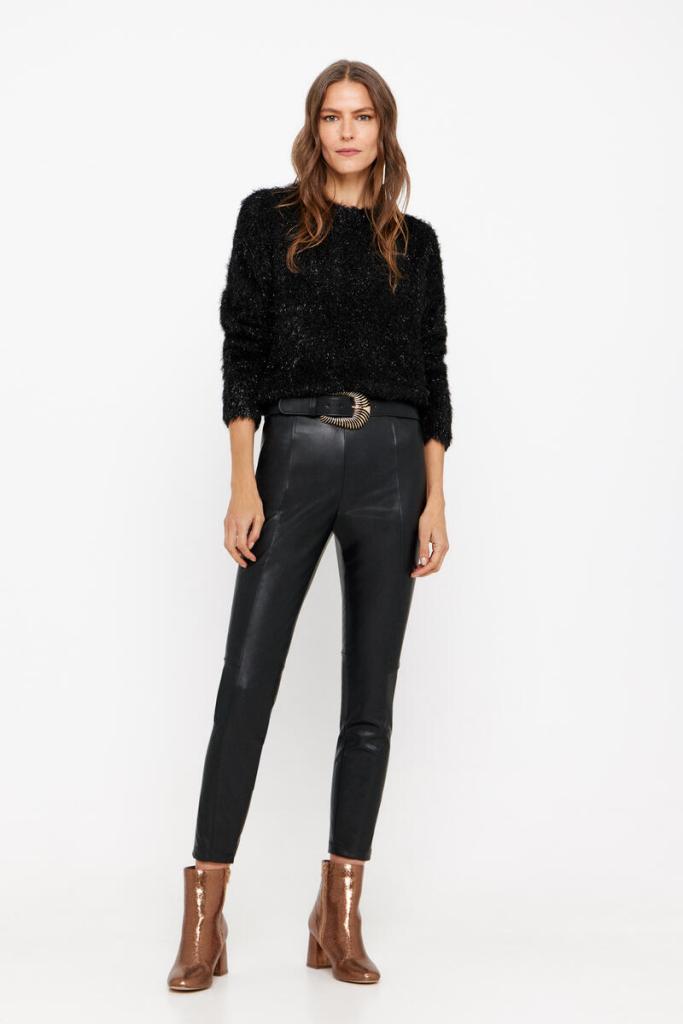 Como augurábamos en el titular, además de cómodo por su corte holgado y de elegante por su acabado metalizado, este jersey nos parece ideal para combinar tanto con pantalones como con falda. Es decir, también es una prenda versátil de Cortefiel. En la imagen, puedes apreciar cómo combina a la perfección con unos pantalones ajustados de efecto piel en color negro y con unos botines metalizados efecto cobre. Este look nos parece ideal para una cena de empresa.