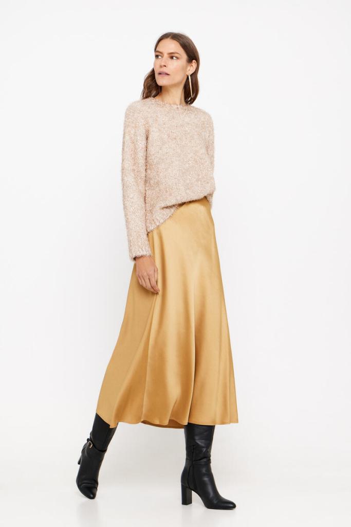 En esta instantánea se ve que este jersey de Cortefiel queda bien tanto por fuera como por dentro con esta falda satinada que estiliza y favorece mucho, y que se combina con unas botas altas negras. Aunque también lo vemos con un pantalón negro tobillero y unos zapatos de tacón, e incluso si priorizas la comodidad puedes combinarlo con unas botas planas o unas manoletinas.
