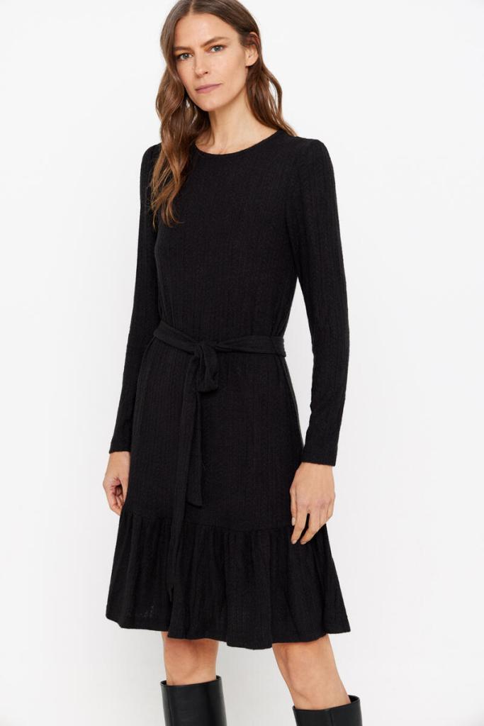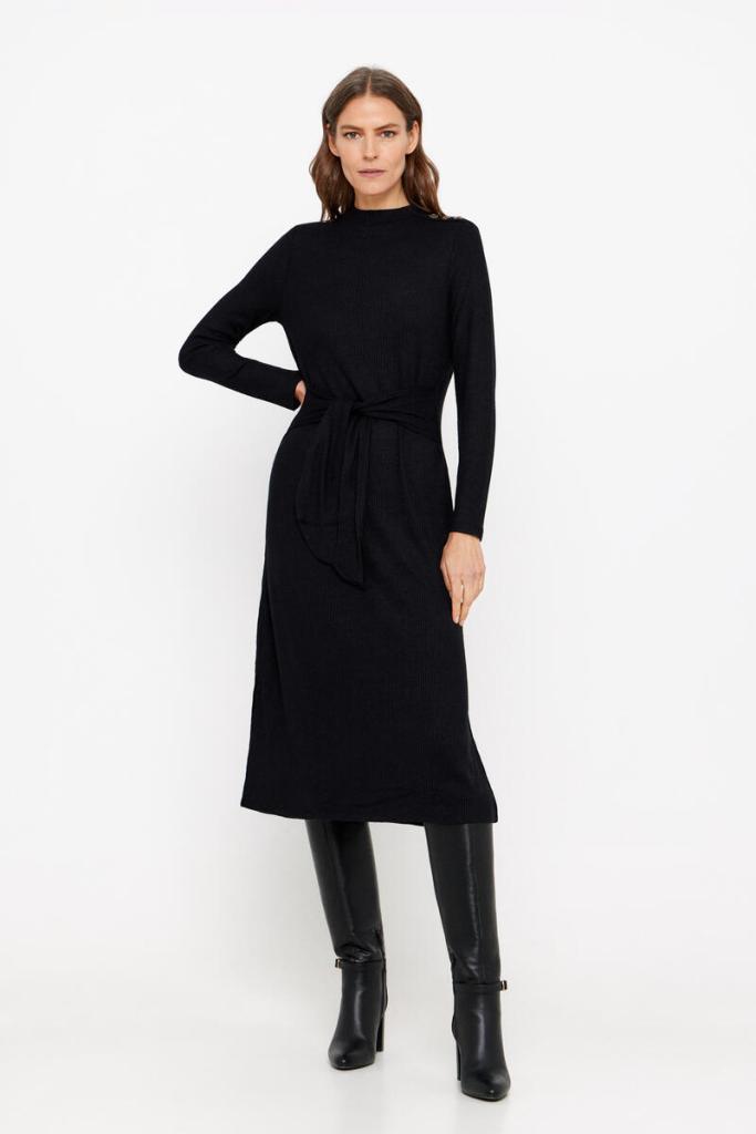 Aunque para comodidad extrema siempre es una buena opción un vestido negro de punto, que son súper confortables e igual de sofisticados que el resto. Este modelo de Cortefiel es la prueba: un vestido corto de punto con estructura de ochos, falda con vuelo, cuello perkins y con un cinturón que da la oportunidad de ajustarlo a la cintura. Con unas botas altas en color negro nos parece que queda ideal, pero con unas zapatillas elegantes puedes aumentar el confort. En este caso, está rebajado a la mitad (59,99 euros 29,99 euros).