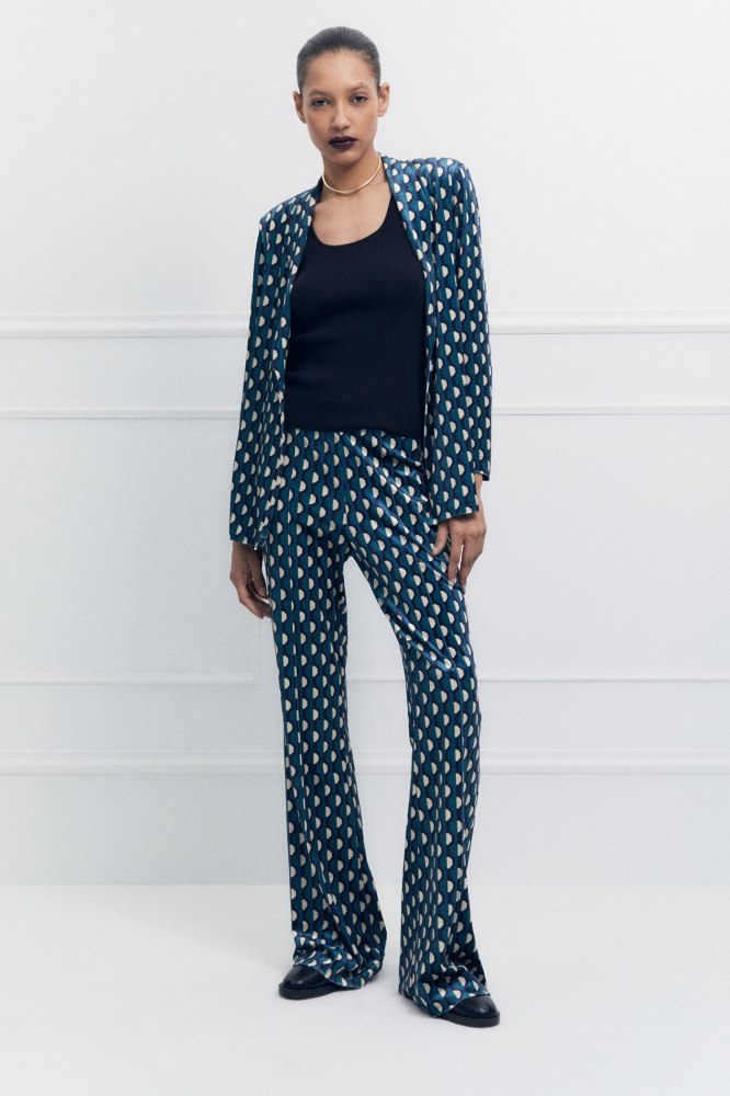 Si huyes de colores neutros y básicos, este modelo de Sfera te encantará. Se trata de un traje de chaqueta que también es de terciopelo, pero que tiene un estampado muy bonito para marcar la diferencia. Es un print típico de los años 70, y como el diseño del dos piezas es súper holgado, resulta súper favorecedor. Como se aprecia, la blazer es muy fluida, y queda ideal sobre tops o camisas negras (29,99 euros). Mientras que el pantalón también es bastante anchito y ligero, y estiliza mucho la pierna (23,99 euros).
