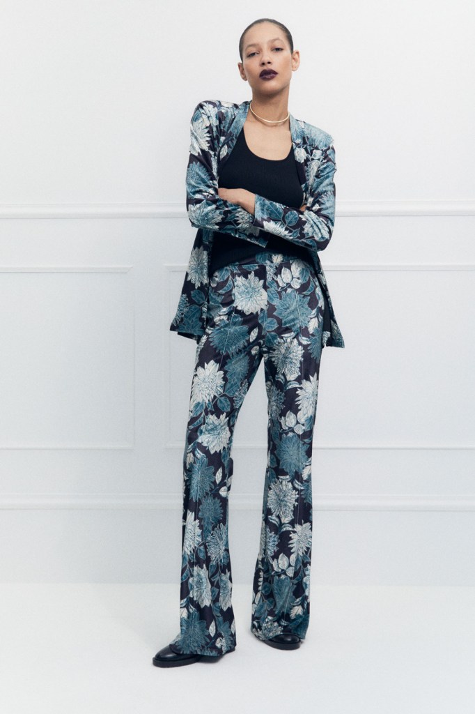 Volvemos a dejar las propuestas de trajes de chaqueta de terciopelo lisos para dar pie a otro dos piezas con estampado. En esta ocasión, se trata de un print de flores en tonos azules que puede ser una opción con la que ir diferente en fin de año. Para las mujeres +50 que le gusten los estampados y las que huyan de los típicos tonos negros o metalizados de estas fechas, es un modelo que nos parece ideal. La blazer vuelve a ser ligera y fluida (29,99 euros), al igual que el pantalón, de pernera ancha y súper cómodo (23,99 euros).