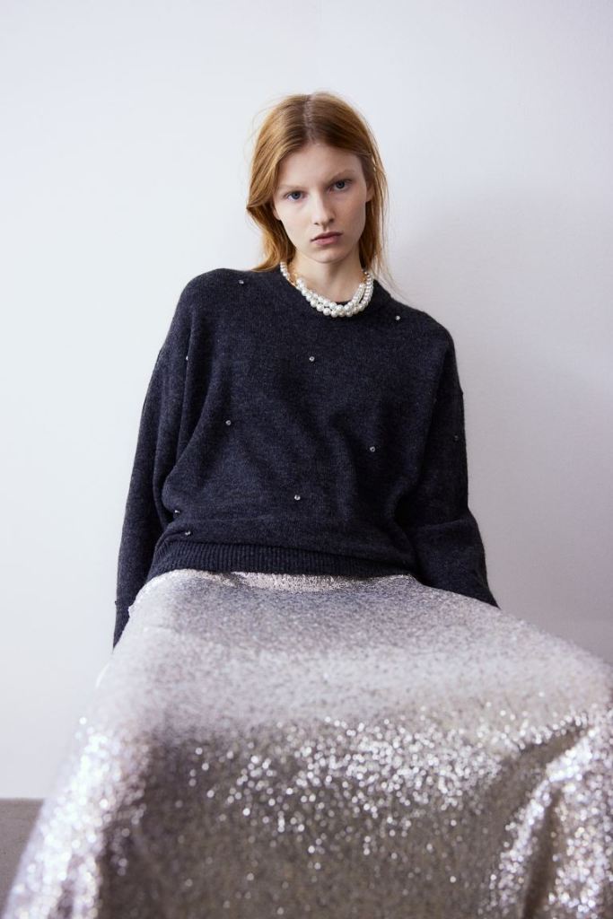 A simple vista parece un jersey sueltecito gris oscuro básico, pero en realidad se trata de un modelo que cuenta con unas cuentas cosidas delante. Por ejemplo, estamos seguras de que enamorará a las mujeres +50 para Nochevieja o cualquier evento de comienzos del año si lo combinas con una falda de lentejuelas, como en la imagen. Pero es que además de bonito, es anchito y cómodo al tener los hombros caídos y la silueta holgada. En este caso, ya está rebajado en H&M más de 10 euros (25,99 euros 14,99 euros)