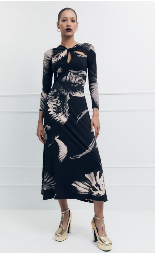 Por último, traemos la opción que va a convertirse en la favorita de las más atrevidas: el vestido estampado con aberturas cut out en la parte delantera.