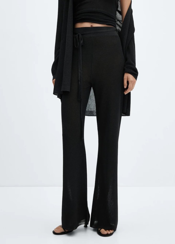 Si eres más de conjuntos de punto en colores oscuros, en las rebajas de Mango encontramos este en un tono negro súper favorecedor. Como parte superior esta vez encontramos un cárdigan fluido con hilo metálico que está súper rebajado y que se queda tirado de precio (49,99 euros 29,99 euros). Al igual que su pantalón a conjunto, que estiliza mucho al tener una silueta acampanada y larga con tiro alto, cintura elástica y una cinta en la cintura con cierre de lazo que lo decora (39,99 euros 27,99 euros).