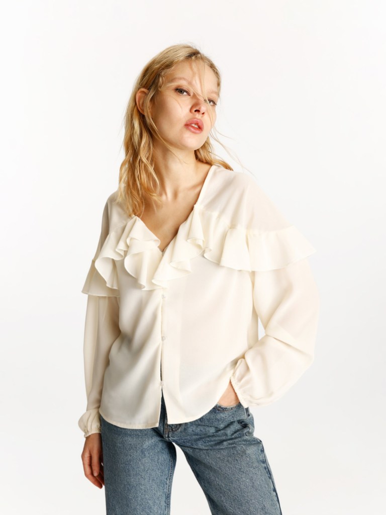 Esta es la camisa de volantes de Zara que ya está agotada en su web y que hemos visto lucir a algunas mujeres +50. Como ves, es una preciosa blusa de color blanco roto cuyo protagonista absoluto es ese volante que decora su escote en pico. Porque sí, aunque veremos este detalle en otras partes de la camisa, los del escote serán los que estén más en tendencia.