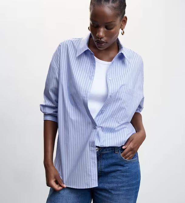 Si buscas una camisa versátil para la primavera, esta de rayas es tu opción ideal. ¿La razones? Te vale para los looks más formales de oficina, combinada con pantalones de pinzas y mocasines, pero también para estilismos más desenfadados llevándola abierta con una camiseta debajo, jeans y zapatillas. Aunque es ancha de por sí, además resulta que estiliza al tener las rayas verticales. Esta cómoda y sofisticada camisa de Mango Outlet es también muy asequible: antes costaba casi 26 euros y ahora menos de 18 (25,99 euros 17,99 euros).