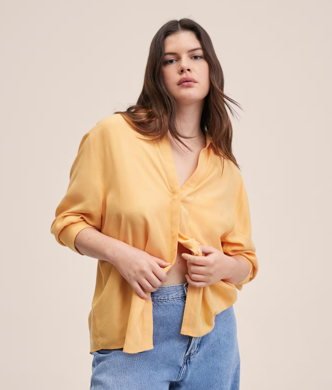 La primavera es sinónimo de colores vivos, así que nada mejor que invertir en camisas con tonos alegres y coloridos para poner diversión a la estación. Por ejemplo, en la propuesta de Mango outlet encontramos esta camisa de color naranja que más acorde no puede ser. Tiene una silueta oversize que resulta cómoda para las mujeres +50. Como se puede apreciar, queda genial tanto con una falda vaquera como un pantalón, por ejemplo, en color marrón. En este caso, la prenda es bastante barata por el descuento del 31% con el que cuenta (25,99 euros 17,99 euros).