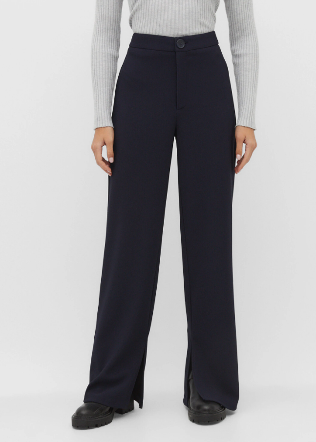 En este mismo sentido, encontramos estos pantalones anchos de Stradivarius que, como puedes comprobar por la imagen, estilizan un montón la pierna. Al ser anchos y en un color oscuro como el azul marino, hacen un efecto óptico que se acentúa aún más si lo combinas con prendas superiores del mismo color. Así parecerás más alta. En este caso, al contar con unas aberturas laterales en el bajo, están pensados para llevar con unas zapatillas o botas de tacón que sean llamativas, y así darle todo el protagonismo. Como no podía ser de otra forma, este modelo cuenta con un descuento del 35% en estas rebajas, lo que lo deja bastante asequible (19,99 euros 12,99 euros).