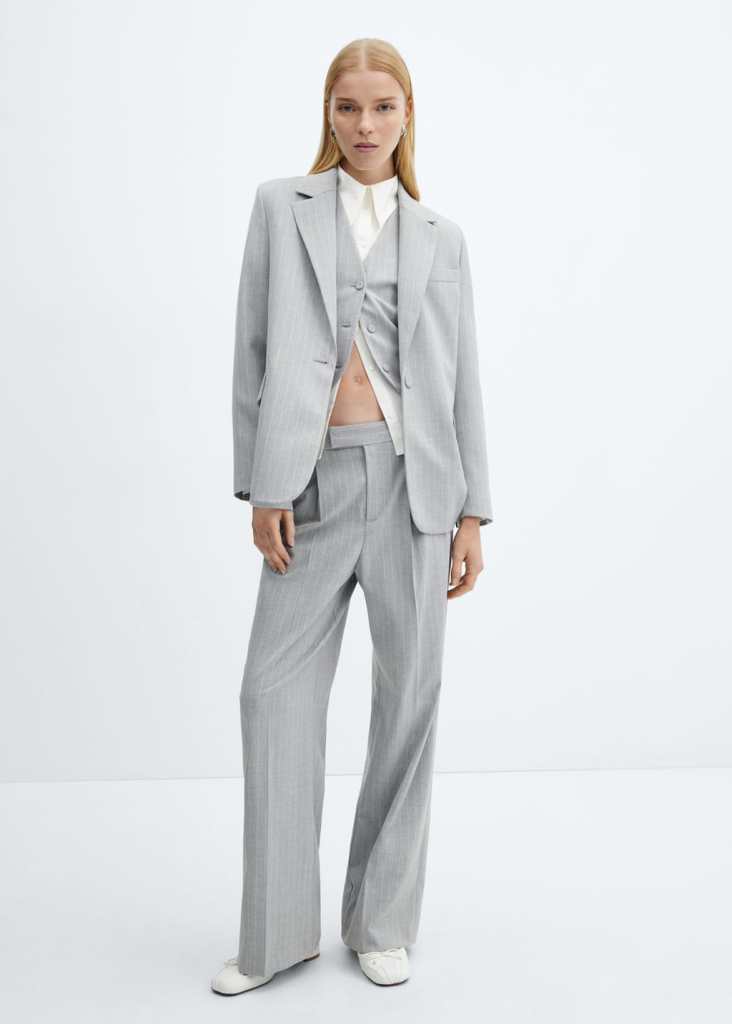Lo de que el gris sea el color del mes de febrero es un hecho irrefutable, y es que hasta son grises los trajes que propone Mango en su nueva colección. ¿Una de las pruebas? Este tres piezas con raya diplomática que, sin duda, llevaría Vicky Martin Berrocal. Ya la hemos visto en otras ocasiones con este tipo de trajes que aportan un toque formal, elegante y con esencia masculina a nuestro look. En este caso, está formado por una blazer clásica con diseño recto (69,99 euros), un chaleco de cuello pico con tirantes anchos y abotonado (35,99 euros) y un pantalón de pernera ancha con pinzas (39,99 euros).