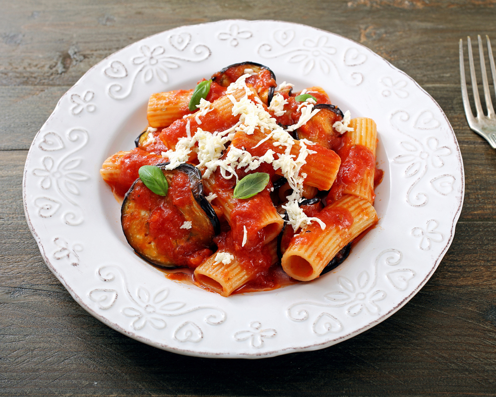 Pela una berenjena y córtala en cubos de 1 a 2 centímetros. Saltéala en aceite de oliva hasta que coja un color dorado. Añade ajo y tomates cortados en cuadradillos. Cocina la salsa hasta que esté ligada y sirve sobre la pasta. No olvides añadir alguna especia por encima.