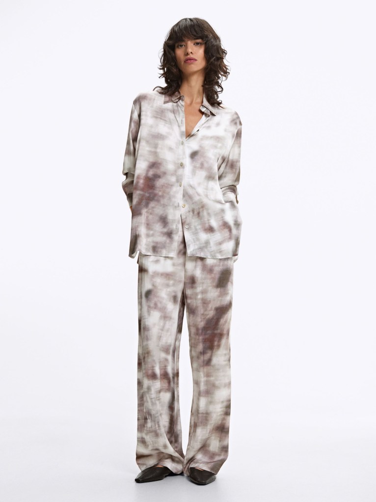 En Parfois no solo encontramos conjuntos lisos, también hay algunos con estampados realmente llamativos, aptos para las más atrevidas. Como ejemplo, este dos piezas con corazones abstractos que se tiñe con el color más en tendencia en la primavera 2024: el azul. De nuevo, encontramos una camisa bastante holgada y con efecto arrugado (32,99 euros) y un pantalón amplio que queda genial con bailarinas o con botas de tacón (29,99 euros). Como ves, se trata de un matching set bastante barato.