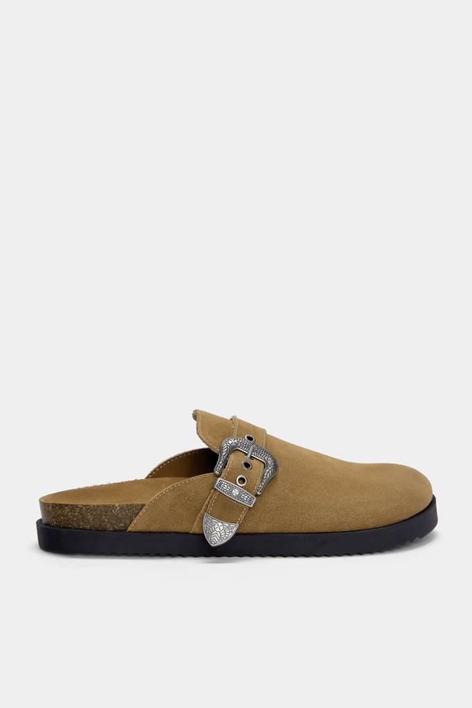 Cada vez son más las mujeres +50 que apuestan por los zuecos en su día a día. Tanto esos que cuentan con un pequeño tacón sensato como los completamente planos, nos parece un calzado muy cómodo que además seguiremos viendo mucho durante la primavera 2024. En el caso de Pull&Bear, encontramos esta pieza de piel con acabado serraje en un tono marrón súper versátil, y con ese detalle de hebilla metálica en la parte lateral. Una vez más, es un zapato de nueva colección de la firma que cuesta menos de 30 euros (29,99 euros).